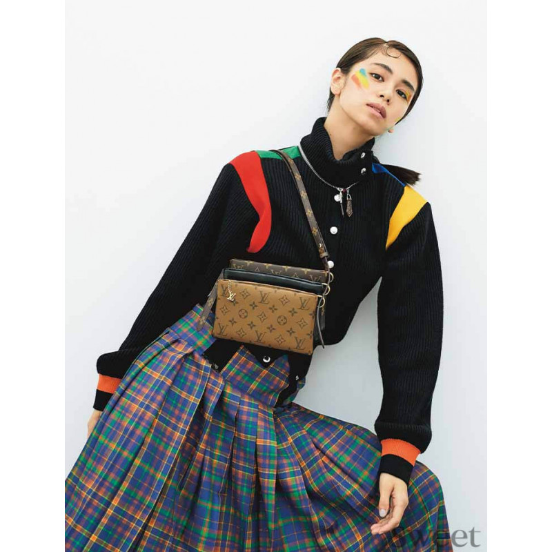 Nicolas Ghesquiere introduceert het LV3 -zakje, een speelse groepering van drie individuele ritszakken die zijn bevestigd met metalen ringen, voor de Prefall 2020. Gevormd van zwarte lambsksel met een reliëf monogrampatroon, monogram canvas en monogram reverse canvas, het stuk heeft een verstelbaar leerstrap. Voor schouder- of kruislichaam draagt.